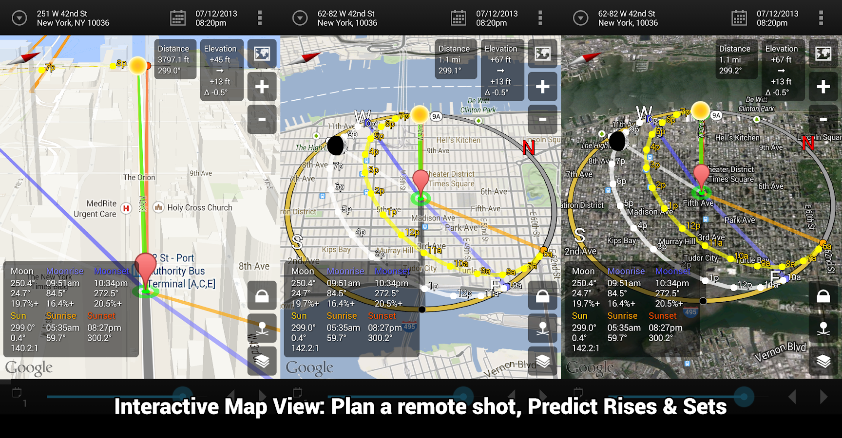 Sun apanhador fornece uma bússola VISTA FLAT e uma realidade CAMERA 3-D VISTA AUMENTADA mostrando o caminho solar, seus intervalos de uma hora, os seus caminhos de inverno e solstício de verão, nasce e se põe vezes e mais e uma visualização do mapa indicando a direção solar para cada hora do dia.